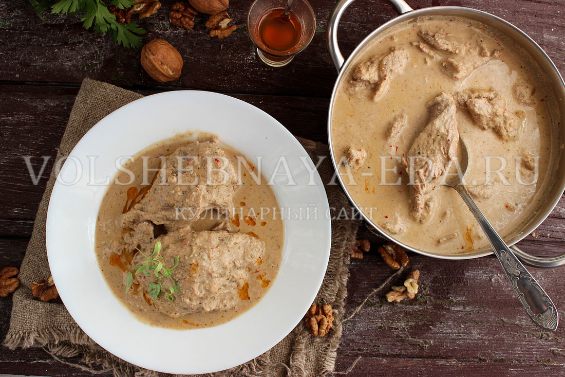 Для соуса грецкие орехи нужно прокрутить с жареным луком и чесноком, добавляя немного аджики. При постоянном прокручивании орехи выделяют масло, что сделает соус еще более насыщенным. Соедините ореховую массу с процеженным бульоном, добавьте специи и доведите до кипения. Лишь в конце добавьте кусочки индейки, тушите еще 15 минут на минимальном огне, не забывая подливать бульон по мере необходимости.