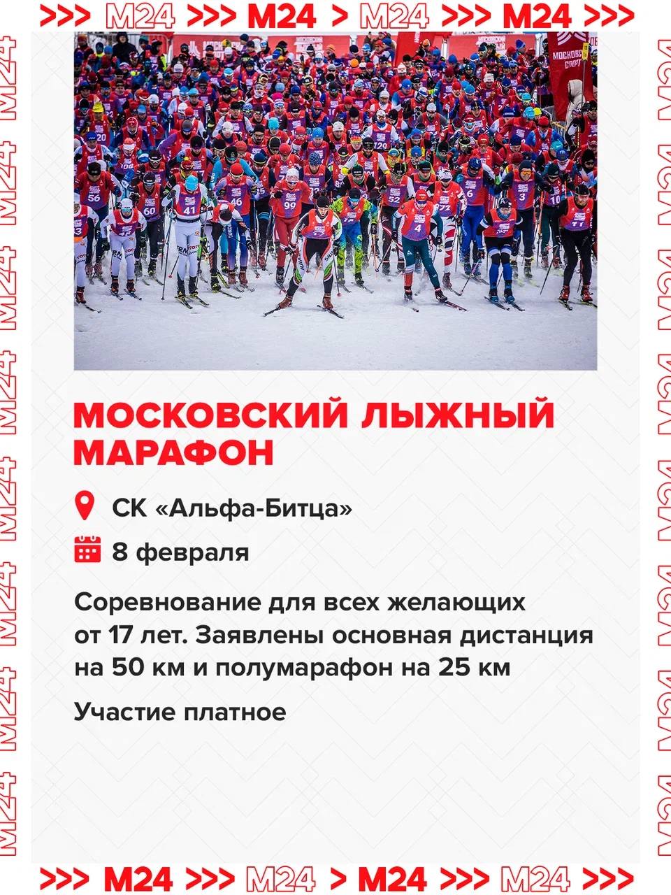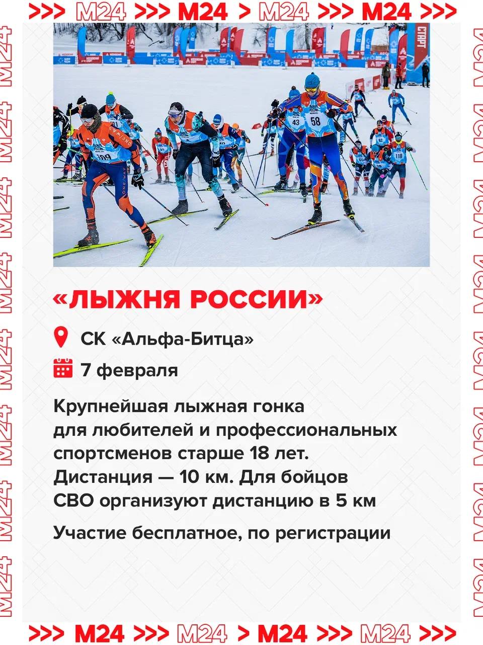 Она пройдёт 4-8 февраля. Каждый день столицу ждут соревнования для участников разных возрастов и уровня подготовки: крупнейшая «Лыжня России», масштабный Московский лыжный марафон, заезды для детей и — впервые — ночная гонка в «Лужниках».