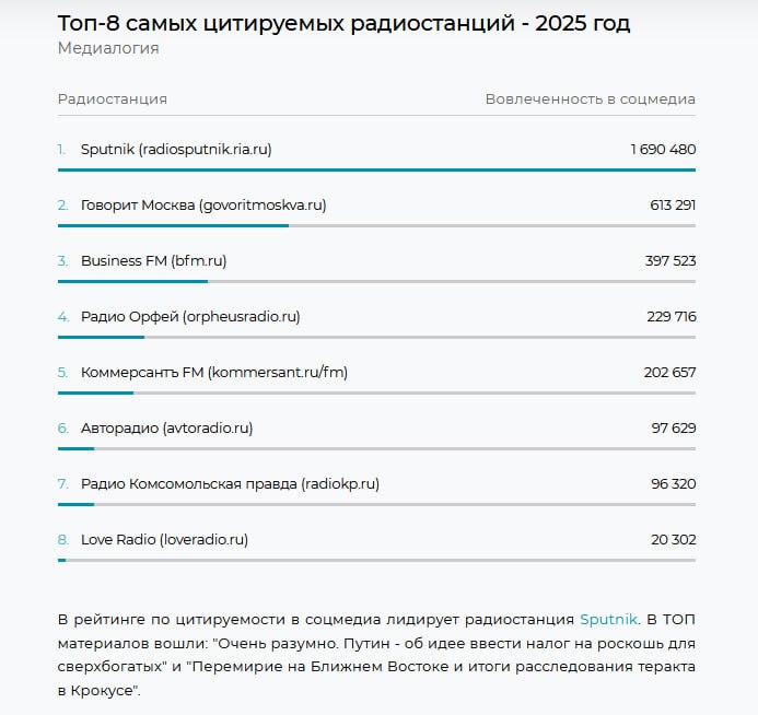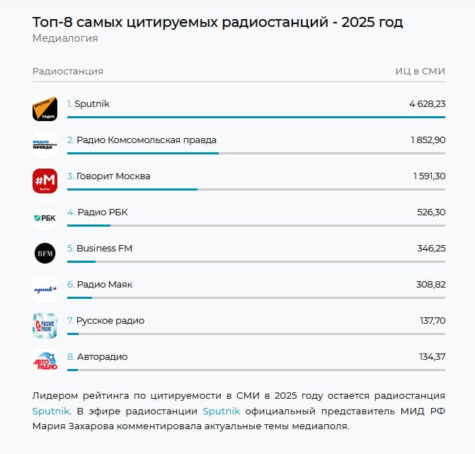 Радио Sputnik — лидер по цитируемости среди радиостанций в СМИ и соцмедиа на протяжении всего 2025 года!