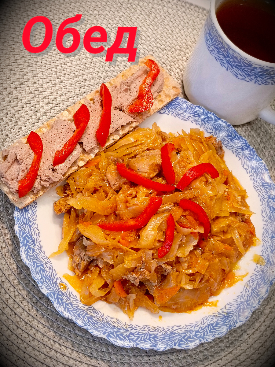 Сегодня на обед был приготовлен аппетитный дуэт тушёная капуста с индейкой, купленной накануне. Это блюдо готовится быстро и обладает насыщенным вкусом. Чтобы добавить немного разнообразия, к горячей капусте подали ржаной хлебец, на который был намазан паштет из печени индейки, также приготовленный заранее. В завершение, на капусту были добавлены полоски сладкого перца, что не только украсило блюдо, но и обогатило его вкус.