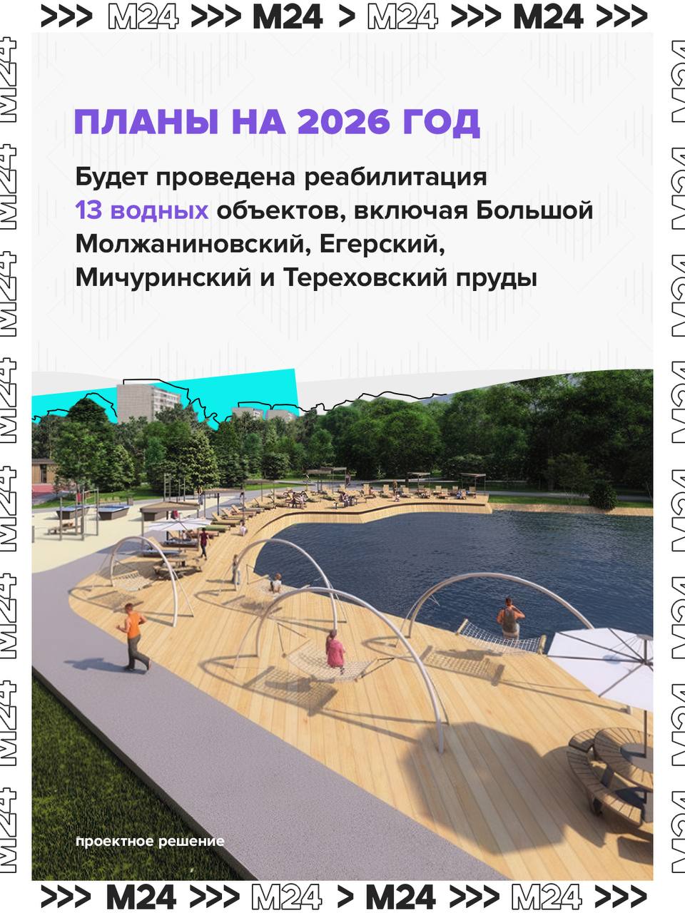 В 2026 году обновят ещё 13 прудов, включая Большой Молжаниновский, Егерский, Мичуринский и Тереховский.