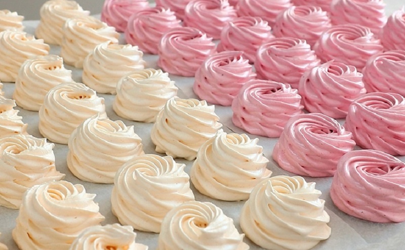 Важно заранее подготовить кондитерский мешок с насадкой «звезда» и застелить рабочую поверхность пергаментом. В небольшой кастрюле смешайте 70 г воды, агар-агар и 150 г сахара. Доведите до кипения и добавьте 200 г фруктового пюре. Взбейте белки с лимонной кислотой и добавляйте сахар постепенно, пока масса не станет устойчивой и блестящей. Горячий сироп тонкой струйкой вводите в белковую массу и продолжайте взбивать до достижения нужной консистенции.