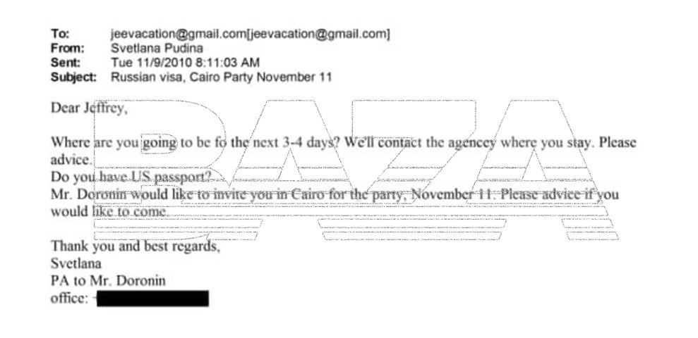 Помимо этого, Эпштейн неоднократно пытался ускорить получение российской визы в конце 2010 и начале 2011 годов. Сначала помощники Доронина предложили обратиться в агентство в Лондоне, но даже после этого быстро оформить визу не удалось. Кроме того, по просьбе Наоми Кэмпбелл помощники Доронина предлагали Эпштейну апартаменты, построенные российским бизнесменом в центре Москвы.