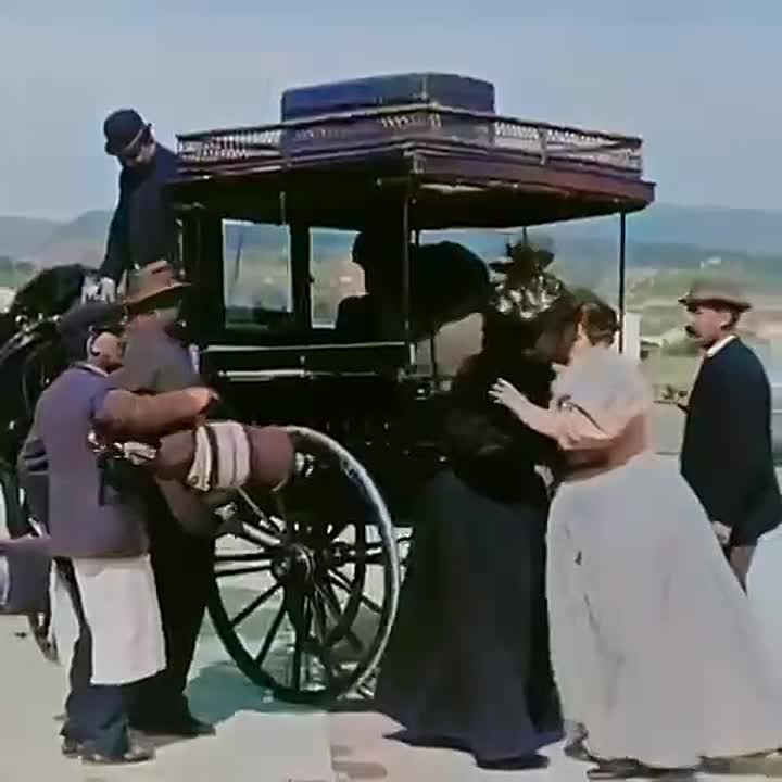 На видео Семья Люмьер отправляется в путешествие, 1895 год. В цвете и с наложенным звуком