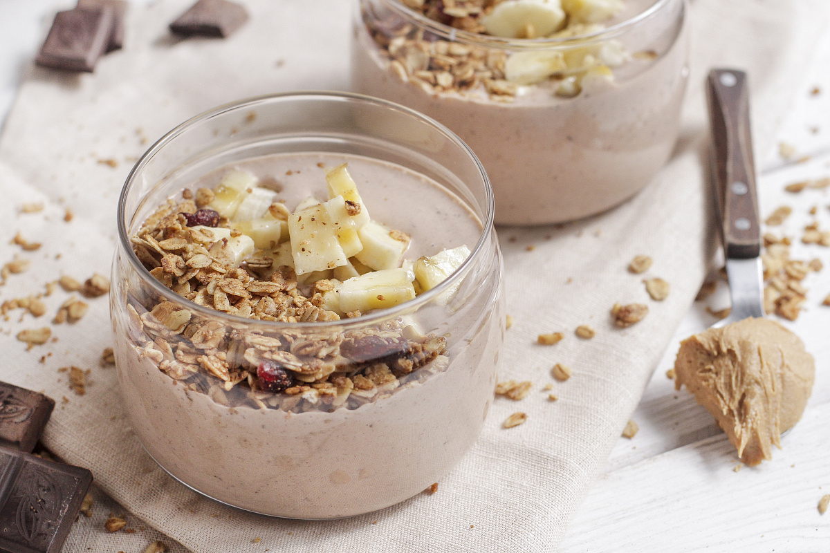Шоколадно-банановый йогурт с добавлением арахисовой пасты и гранолы способен порадовать не только гурманов, но и всех ценителей сладких десертов. Этот простой и быстрый рецепт станет отличным вариантом для легкого и полезного перекуса или десерта. Идеальное сочетание сладкого банана, насыщенного шоколада и хрустящей гранолы удивит даже самых требовательных!