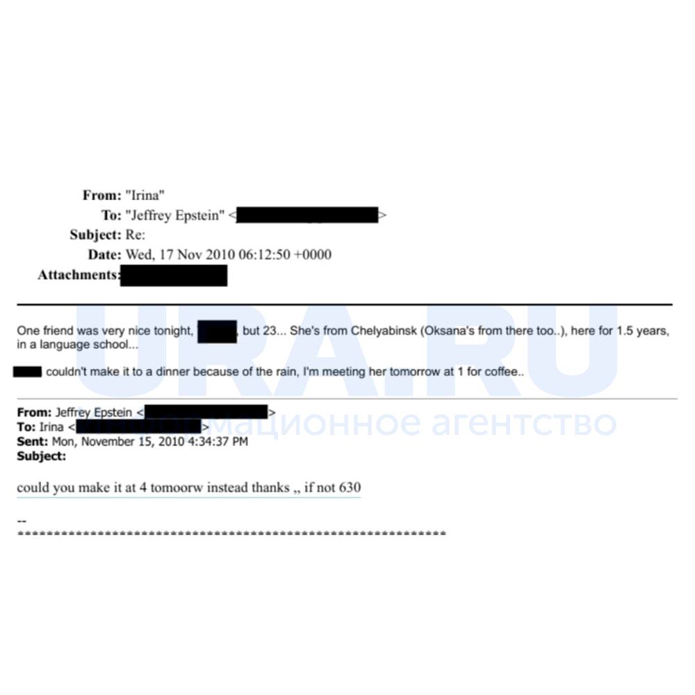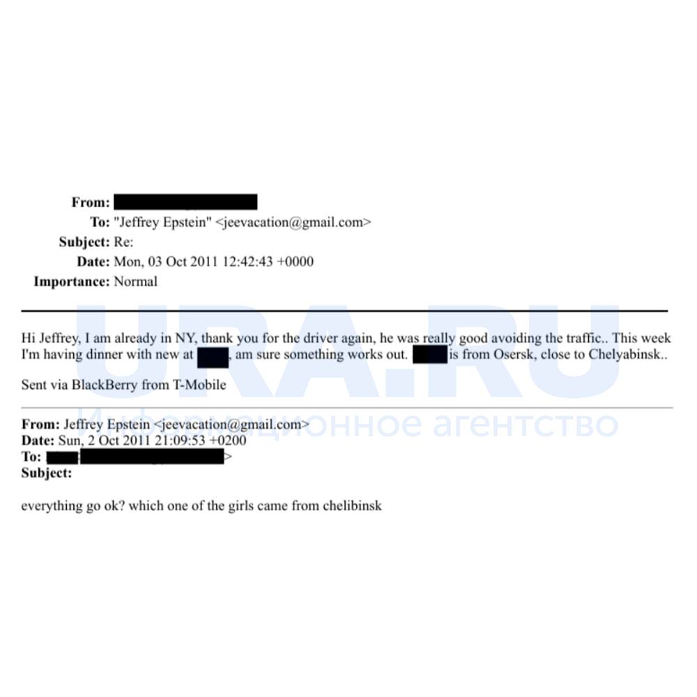 Эпштейну сообщали минимум о двух девушках из Челябинска, а также об одной из Озерска. Он уточнял с ошибкой, которая из них из chelibinsk. Видимо, во вложении были фотографии;