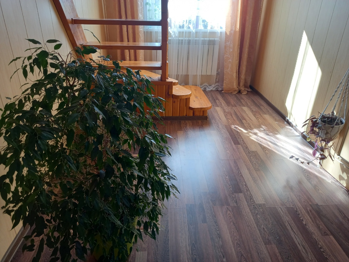 На втором этаже, в спальне с одним окном, живут два натурализованных растения: шефлера и замиокулькас. Несмотря на недостаток света, шефлера стойко переживает условия и создает атмосферу уюта. Однако стоит отметить, что ей явно не хватает яркости. Замиокулькас, ранее роскошный на кухне, переехал сюда после неудачного инцидента, когда его массивные листья оказались не на шутку опасны для домочадцев.