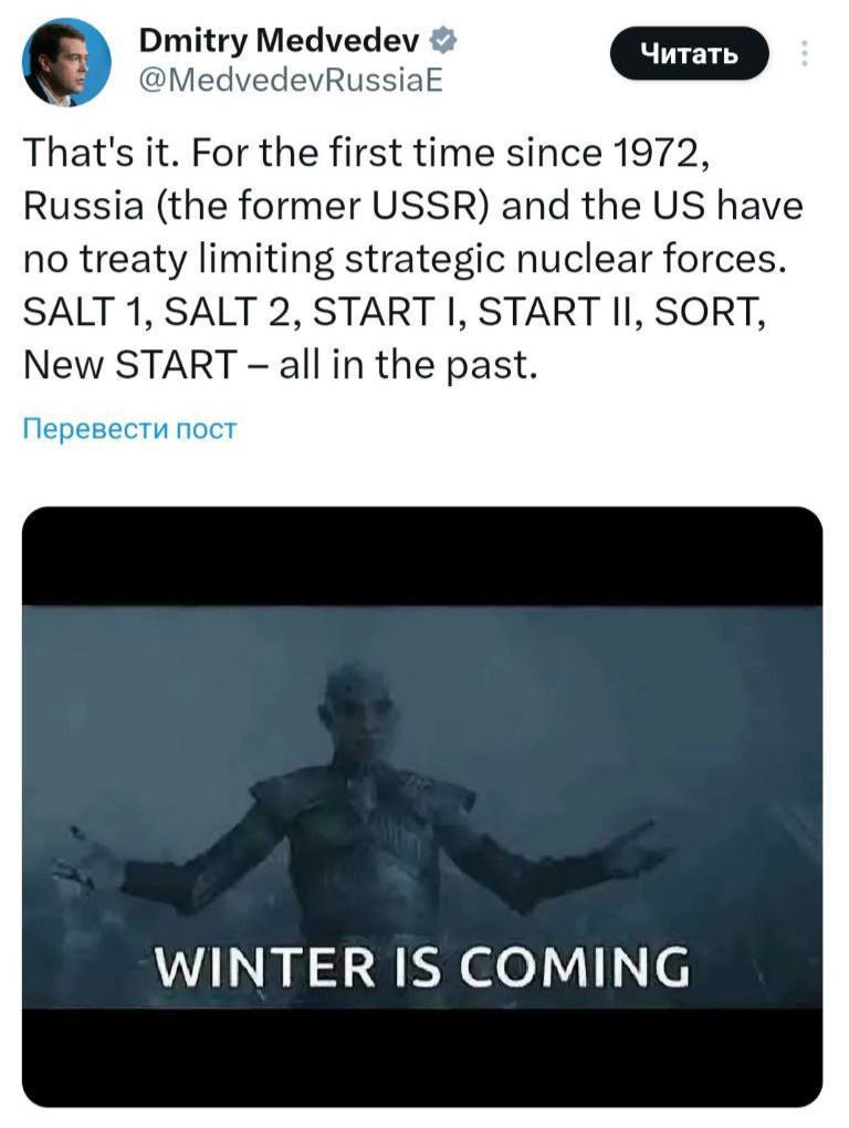 «Зима близко» — Дмитрий Медведев подбодрил иностранцев картинкой из «Игры Престолов» по случаю прекращения действия Договора о стратегических наступательных вооружениях с США.