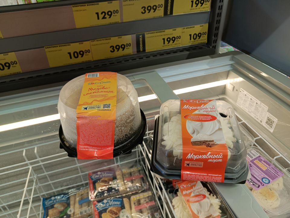 - Торты: «Морковный» и «Медово-сливочный» массой 500 г по цене 399 рублей. Несмотря на простоту оформления, оба имеют потенциал стать звездой стола.