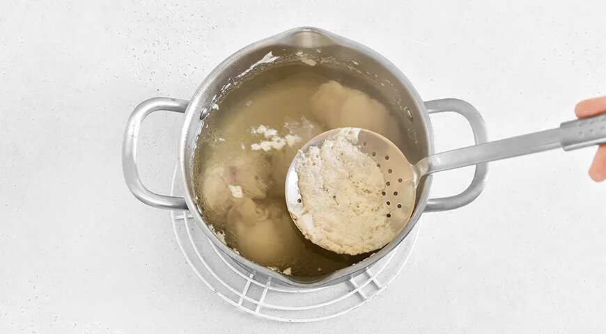 Первым делом, куриное мясо хорошо мойте, затем поместите его в кастрюлю и залейте 2,5 литрами воды. Поставьте на средний огонь и дождитесь закипания. Когда бульон начнет бурлить, удалите образующуюся пену. Уменьшите огонь и оставьте вариться на полчаса.