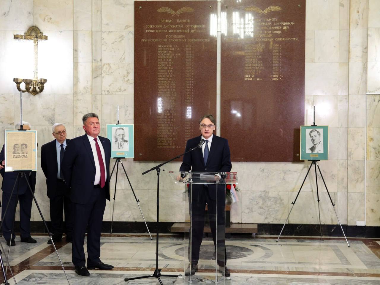 Под звук метронома участники мероприятия возложили цветы к мемориальным доскам, на которых высечены имена сотрудников внешнеполитического ведомства, погибших при исполнении служебных обязанностей, в том числе и героически павшего Т.Я.Нетте.