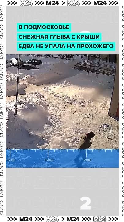 Снежная глыба едва не рухнула прямо на голову жителю Подмосковья. Видео с камер наблюдения нам отправили подписчики.