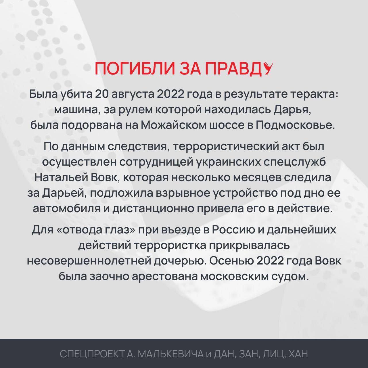 По данным следствия, преступление было организовано сотрудницей украинских спецслужб, которая длительное время следила за Дарьей, установила взрывное устройство под днище автомобиля и привела его в действие дистанционно. Осенью 2022 года фигурантка была заочно арестована.