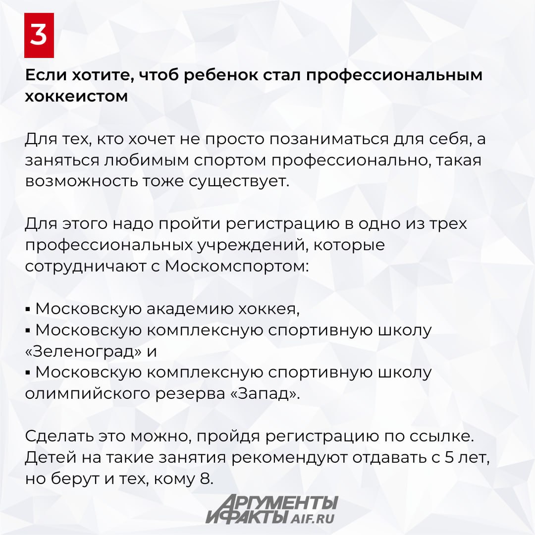 Заняться хоккеем в Москве можно совершенно бесплатно и детям, и взрослым. Для этого достаточно зарегистрироваться на mos.ru и на сайте «Московского спорта». Здесь предоставляются сервисы записи в популярнейшие хоккейные центры для спортсменов от 6 до 44 лет.
