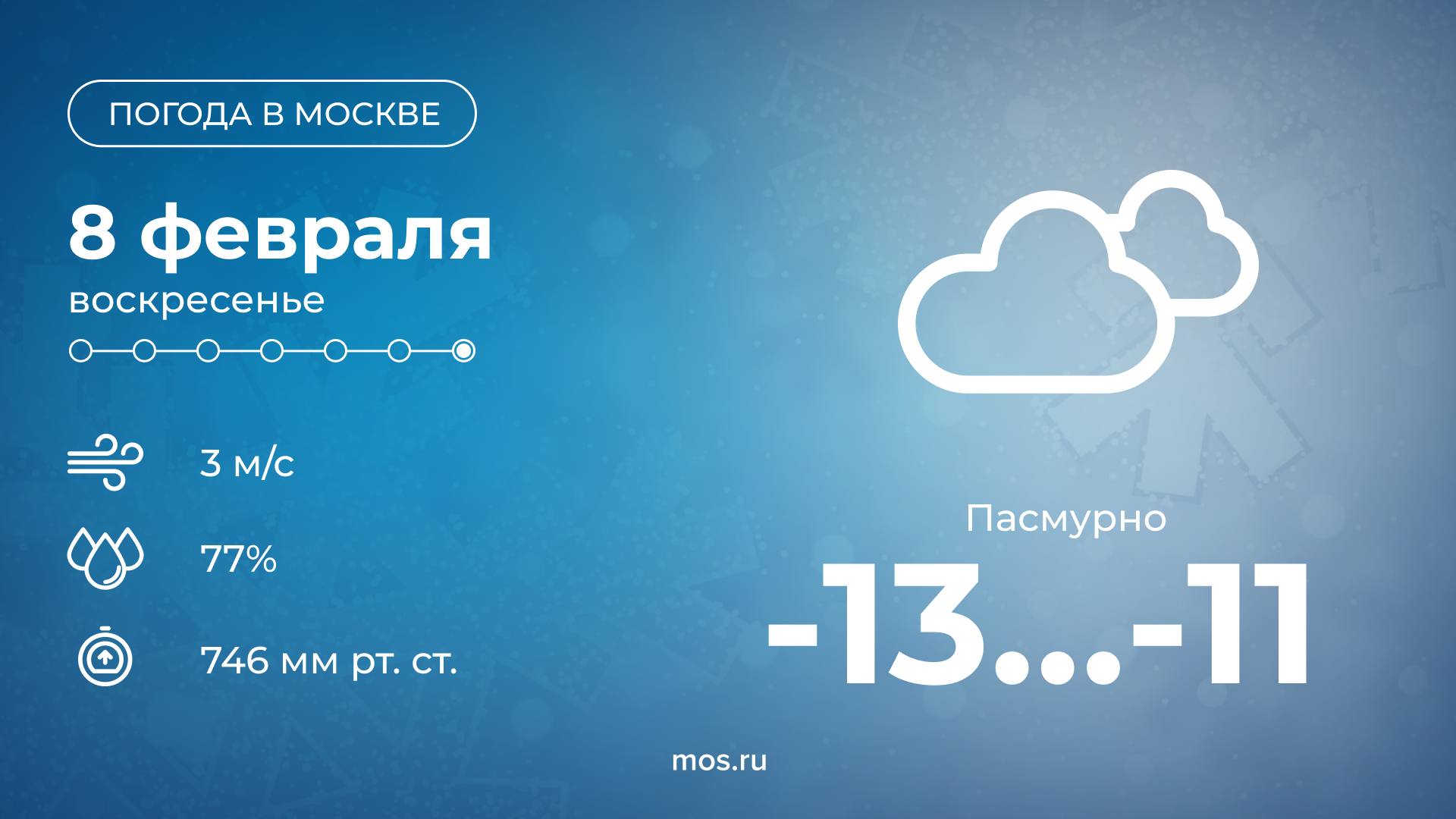 Доброе утро! Сегодня в столице будет пасмурно. Столбики термометров днем покажут от 13 до 11 °С. Одевайтесь теплее!