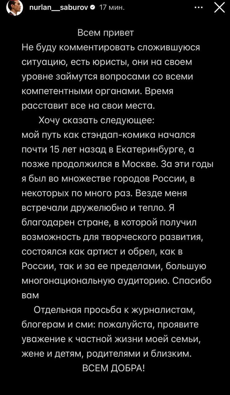 Комик опубликовал сторис и поблагодарил страну, где состоялся как артист. Ситуацию с депортацией он не комментировал, но попросил с уважением относиться к частной жизни его семьи.