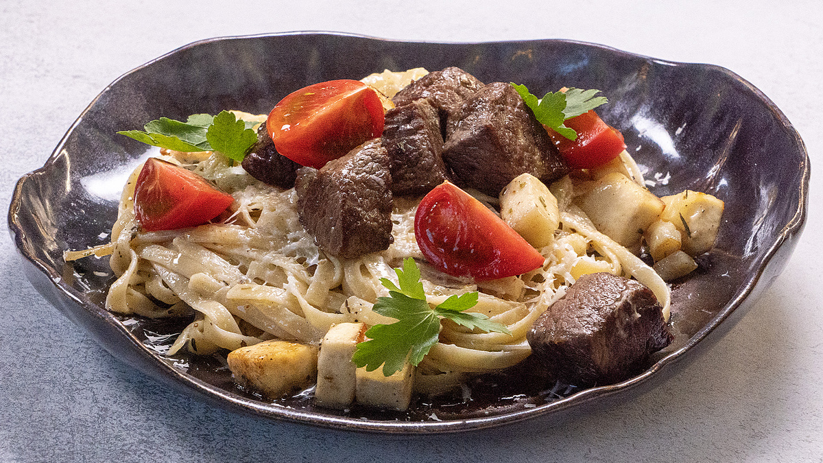 Романтический ужин: Макароны с жареным стейком и сыром в итальянском стиле