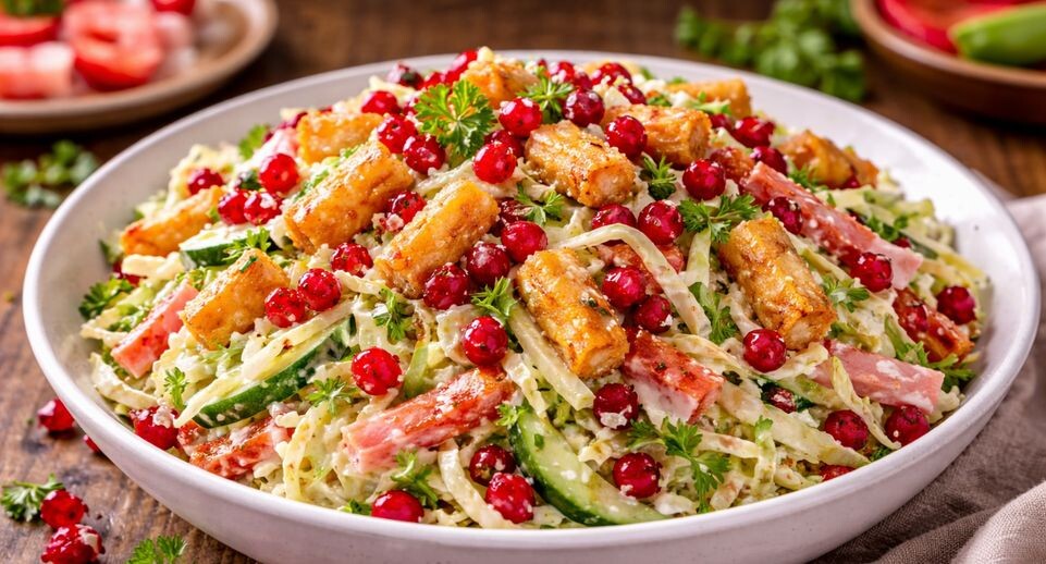 Шаг 3: Приготовление заправки и финальная сборка. В отдельной емкости смешиваются йогурт, чеснок и лимонный сок. По вкусу добавляется соль. В большом салатнике объединяются все подготовленные компоненты: капуста, ветчина, огурцы и остывшие крабовые палочки. Салат заправляется приготовленным соусом и осторожно перемешивается. Завершают оформление щедрой порцией гранатовых зерен.