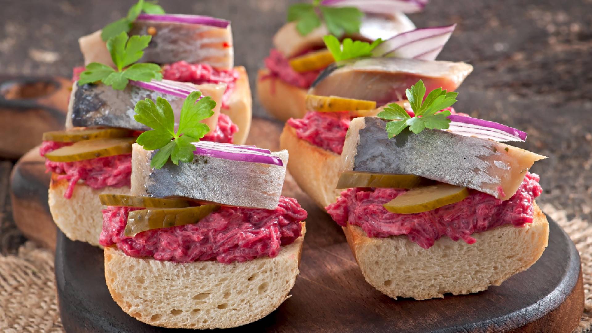Маринованные огурцы порежьте на тонкие пластинки. Филе селедки — на полоски. Начинайте собирать канапе. Выкладывайте на хлеб одну ложку свекольной подушки. Сверху на нее сверху кусочек сельди и огурчик. Закрепите шпажкой, рекомендует Дзен-канал «6 Соток», пишет Городовой.