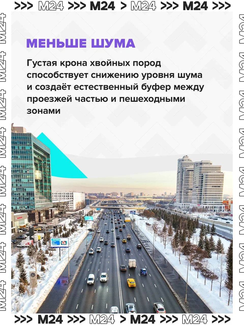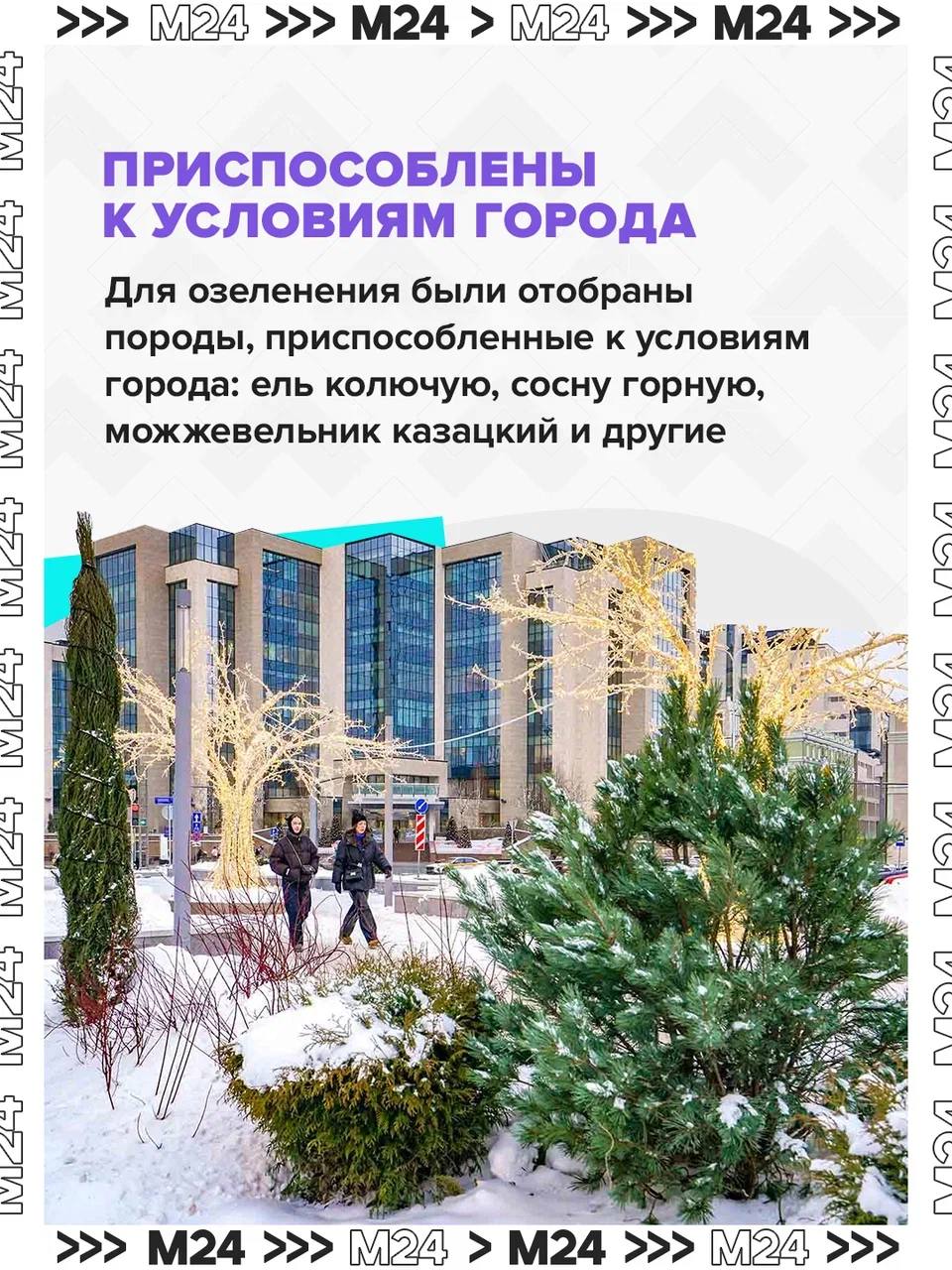 Густые деревья делают московские улицы тише, а ещё создают буфер между дорогами и зонами для пешеходов. Поэтому благоустроенные территории засаживают вечнозелёными растениями.