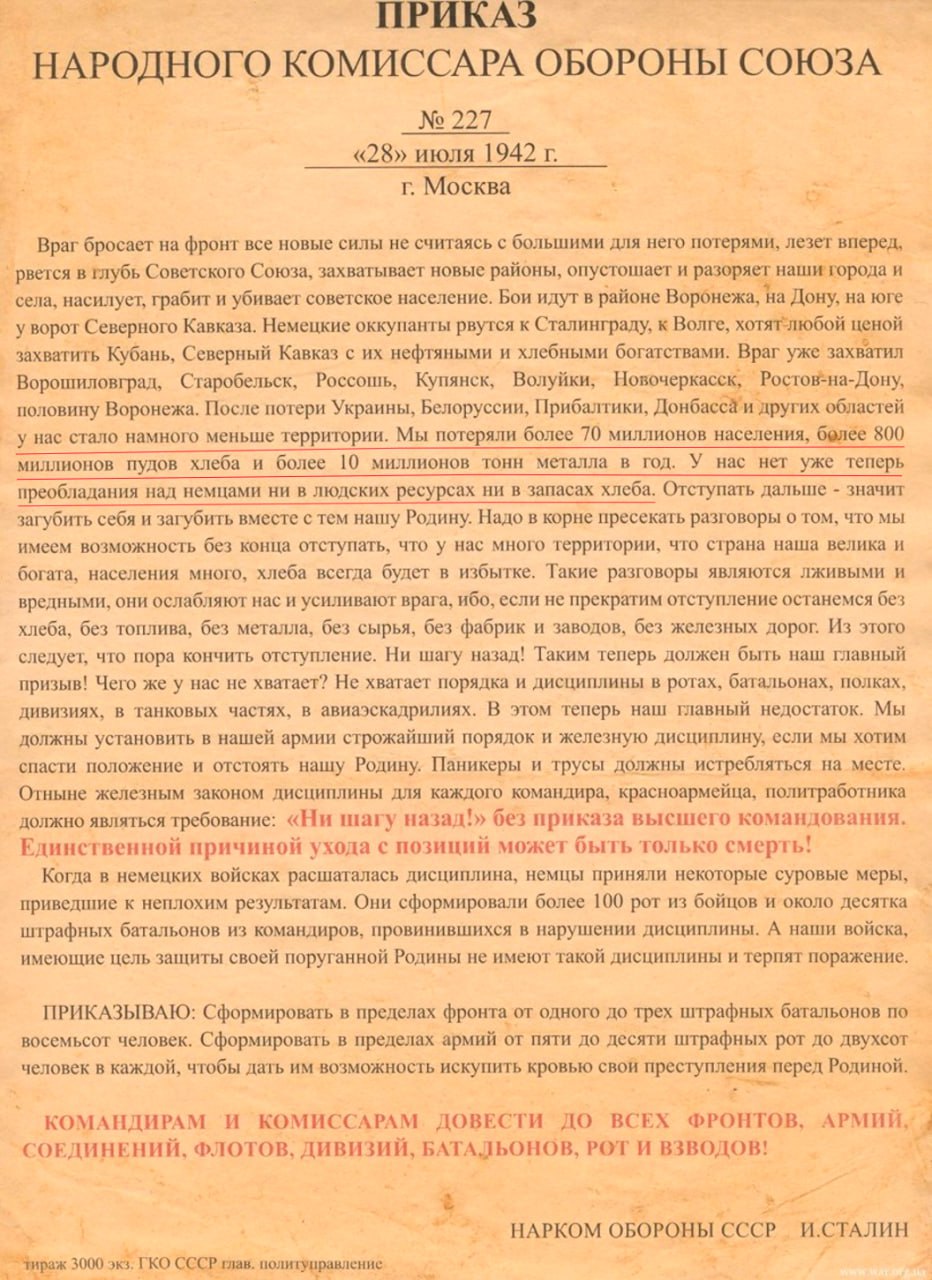 Мы потеряли более 70 млн населения, более 80 млн пудов хлеба в год и более 10 млн тонн металла в год. У нас нет уже преобладания над немцами ни в людских ресурсах, ни в запасах хлеба. Отступать дальше значит загубить себя и загубить вместе с тем нашу Родину.