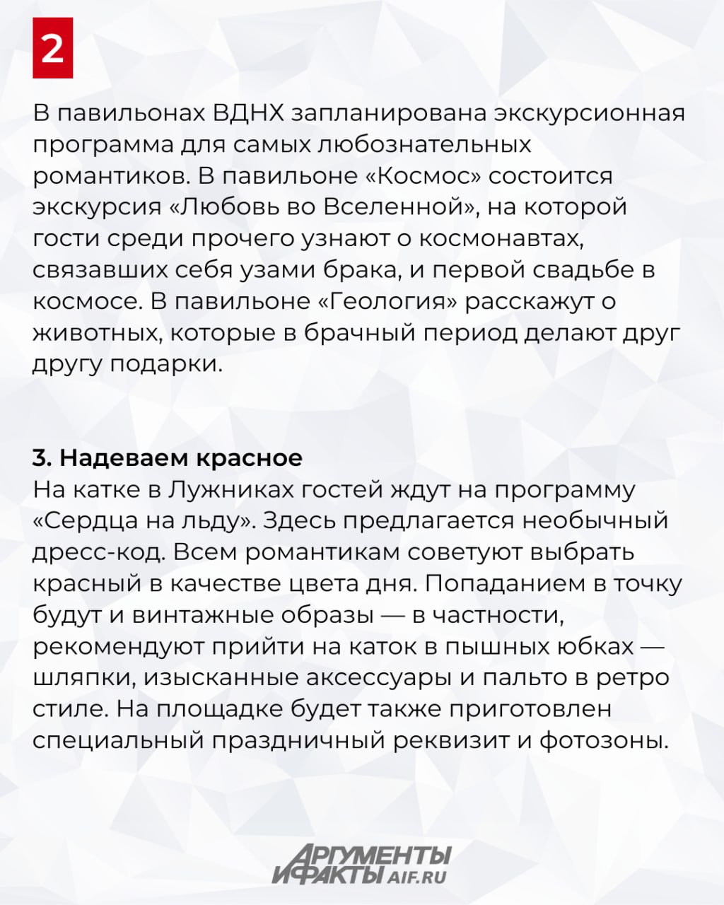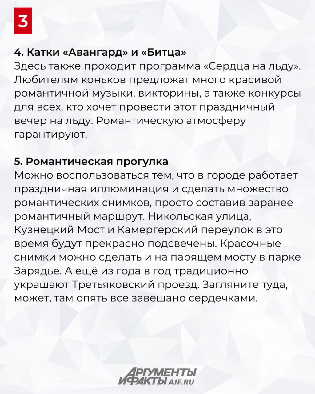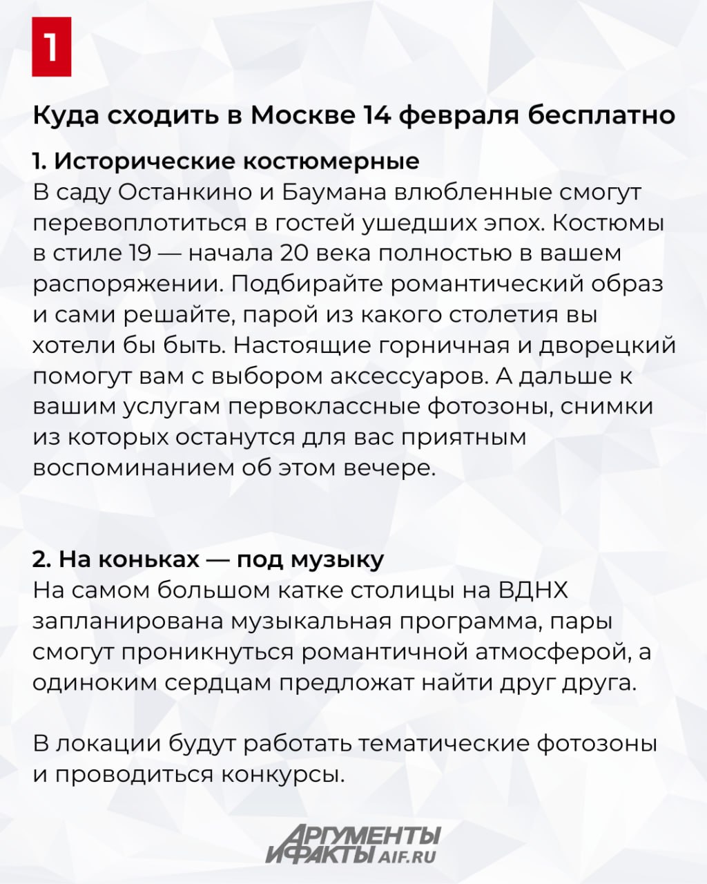 День всех влюблённых 14 февраля хочется провести романтично. И Москва предлагает такие возможности. Вооружайтесь коньками или примеряйте исторические образы для фото. Главное — со своей второй половинкой. Все подробности в карточках.
