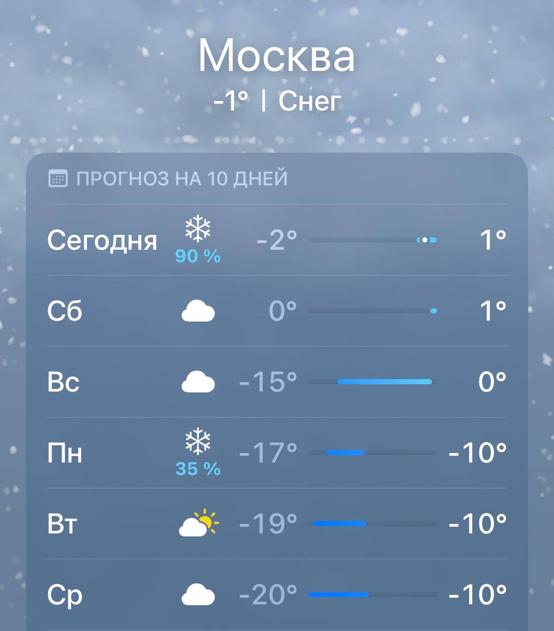 «Сегодня в столице потеплеет до плюс 3 градусов. С неба все время будет что-то сыпать или литься — снег, мокрый снег, снег с дождем и даже просто дождь. В субботу плюсовая температура (плюс 1-3 градуса) продержится целый день. Тоже будет слякотно и промозгло, с мокрым снегом и дождем».