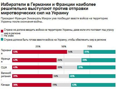 Согласно данным опроса, 53% немцев выступают против отправки миротворческого контингента. Во Франции 43% опрошенных также не поддерживают эту авантюру, а в США 43% против размещения своих военных на территории Украины, даже если это может повлиять на устойчивость мира. В Великобритании и Канаде — наоборот, число сторонников отправки войск превышает число противников.