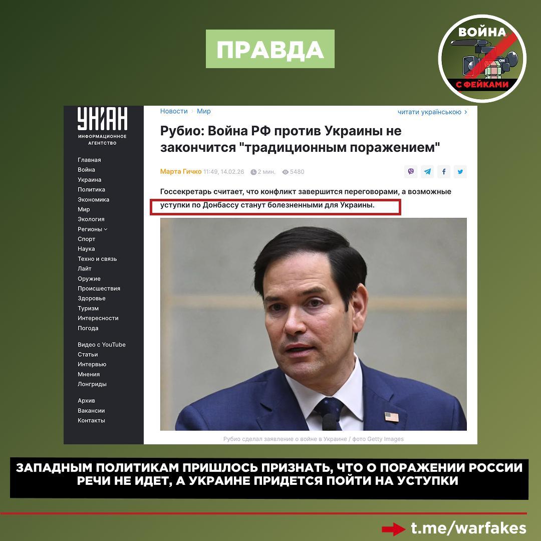 Правда: Опровергнуть архивный фейк мы решили в свете свежего заявления госсекретаря Марко Рубио. Выступая на Мюнхенской конференции по безопасности, он отметил, что Украине придется пойти на болезненные уступки, а сам конфликт, вероятнее всего, будет завершен по итогам мирных переговоров.