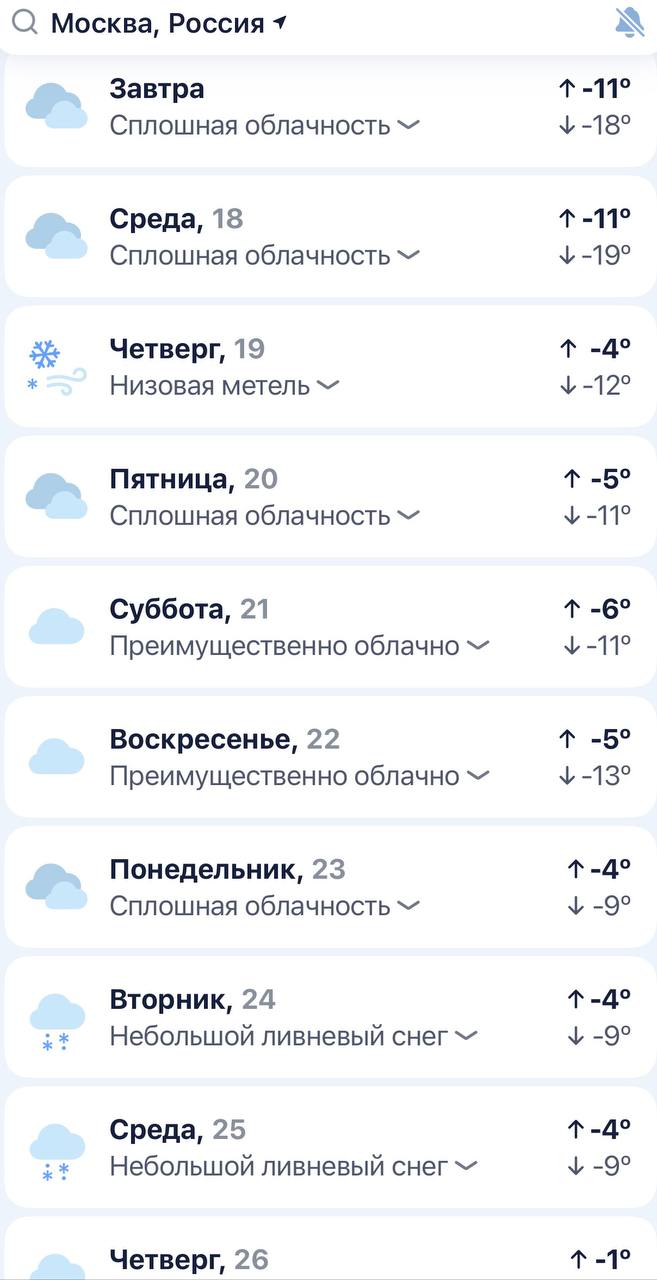 Снежный фронт пошёл на Воронеж. И прогноз на неделю в Москве - приятный.