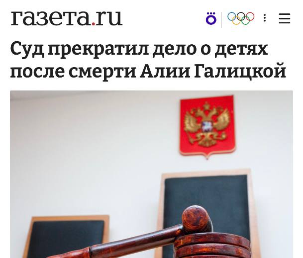 «Пресненский районный суд Москвы вынес определение о прекращении производства по спору между Алией и Александром Галицкими об определении места проживания их детей и взыскании алиментов. Процесс завершен в связи со смертью одной из сторон.