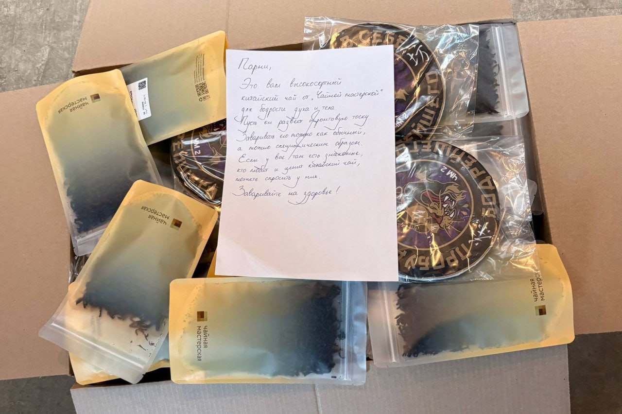 «Мы отправляем все, что у нас есть в чайной, чтобы развеять фронтовую тоску, потому что от этого напитка на душе становится приятнее и теплее. Для бодрости духа и тела — наши фирменные шу пуэры. Сейчас зима, холодно, поэтому в посылки положили и красные чаи. Они очень хорошо тонизируют и согревают. Добавили также тегуаньинь и да хун пао, чтобы расслабиться, а еще наш иван-чай», — поделился Сергей.