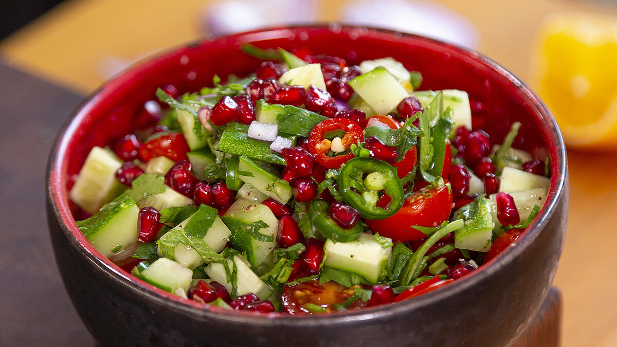 Для пикантности и остроты нарежьте чили-перец и добавьте его в салат. Не забудьте мелко покрошить свежую кинзу, мяту и базилик, которые привнесут в блюдо насыщенные ароматы. Затем добавьте зерна граната, полейте всё лимонным соком, и по вкусу добавьте соль и перец. Для особого шика используйте четверговую соль — она добавит уникальность вашему творению.