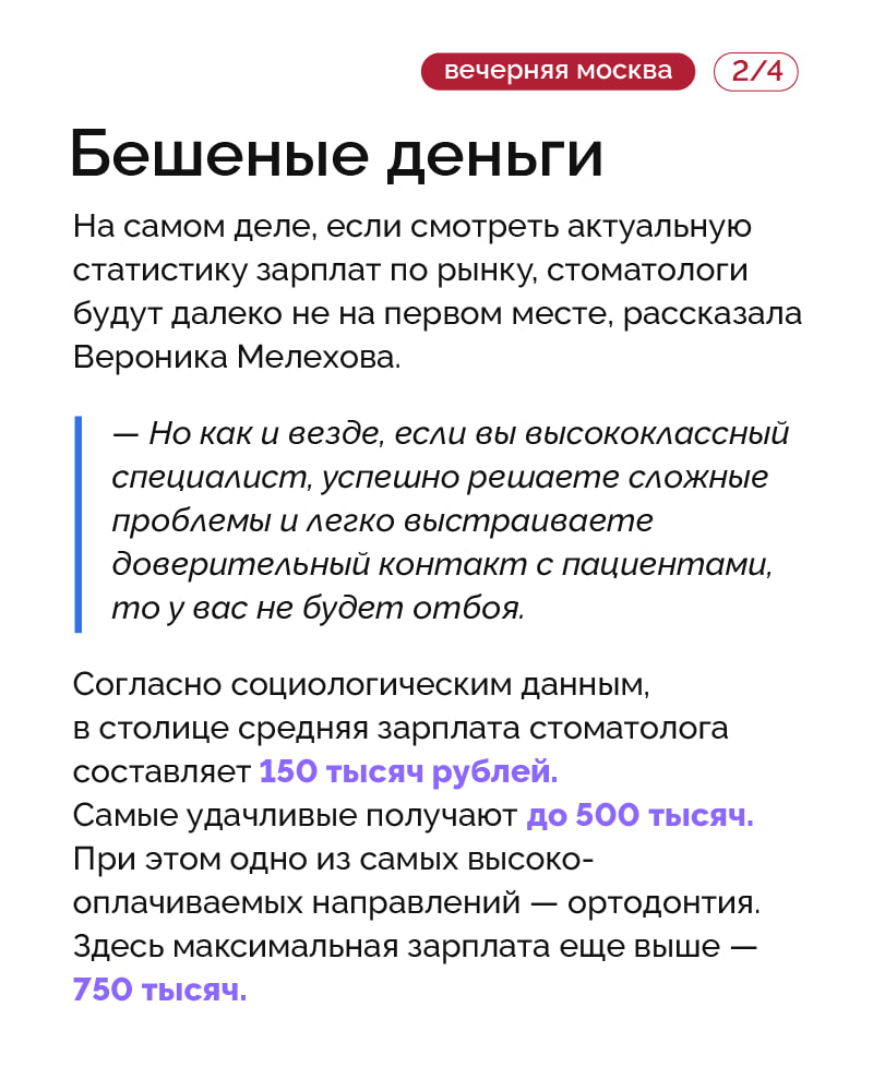 Но действительно ли такие врачи зарабатывают сотни тысяч рублей в месяц? Разбираемся, сколько сегодня получают стоматологи, почему доходы так различаются и на что обратить внимание пациентам при выборе доктора. Подробнее — в карточках.