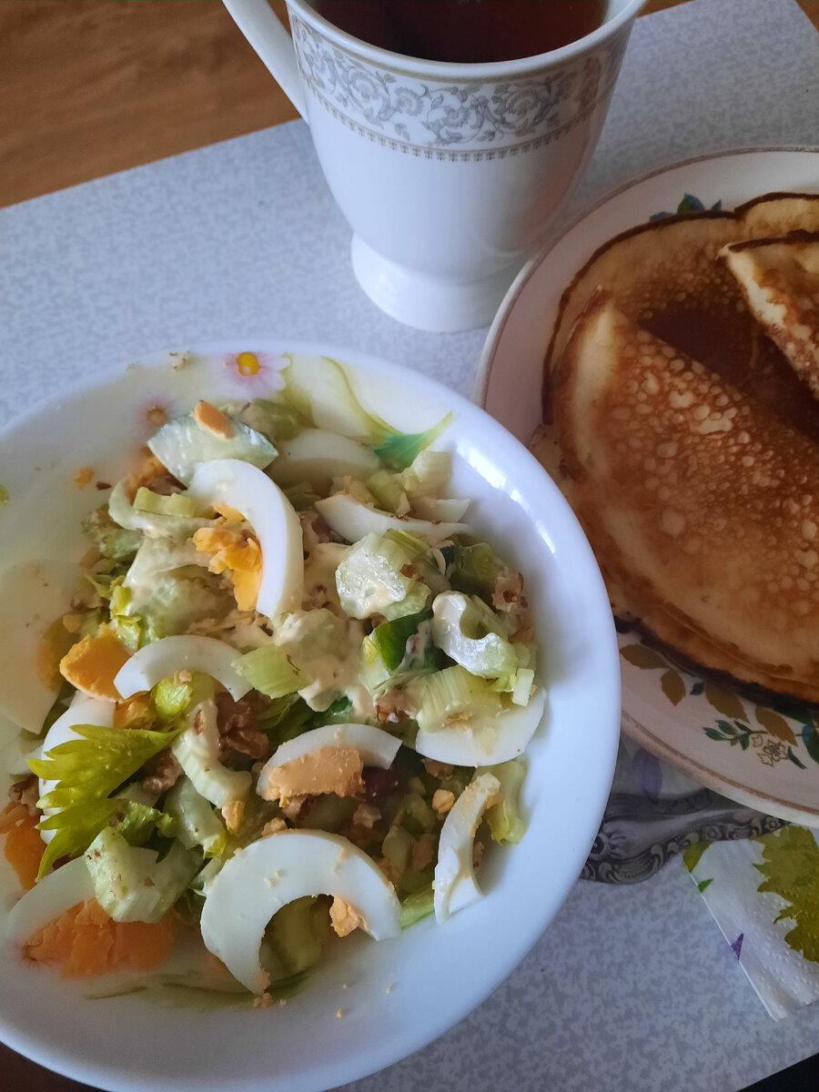 Вот пример сбалансированного завтрака: блины в сочетании с любимым салатом из сельдерея, яиц и свежих огурцов. Такой подход позволяет наслаждаться вкусом, заботясь о своем здоровье, сообщает Дзен-канал "Здесь все вкусно.".