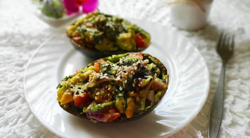 - Заполнить половинки авокадо получившимся салатом.