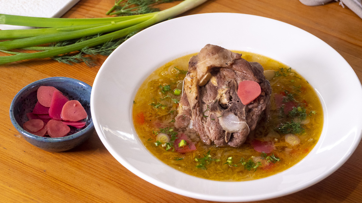 Проварите еще 5 минут, доведя блюдо до идеального состояния. Подавайте суп горячим с маринованным чесноком и свежей зеленью — для настоящего настроения!