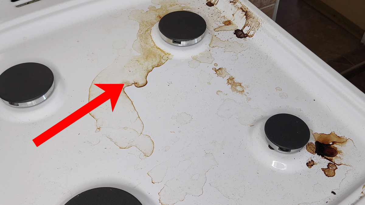Следующий шаг — аккуратно залить плиту кипятком. Будьте внимательны: важно избегать попадания воды внутрь конфорок.