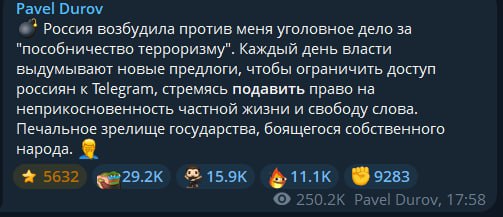 Он заявил, что обвинения являются попыткой ограничить доступ россиян к Telegram и подавить право на неприкосновенность частной жизни и свободу слова.