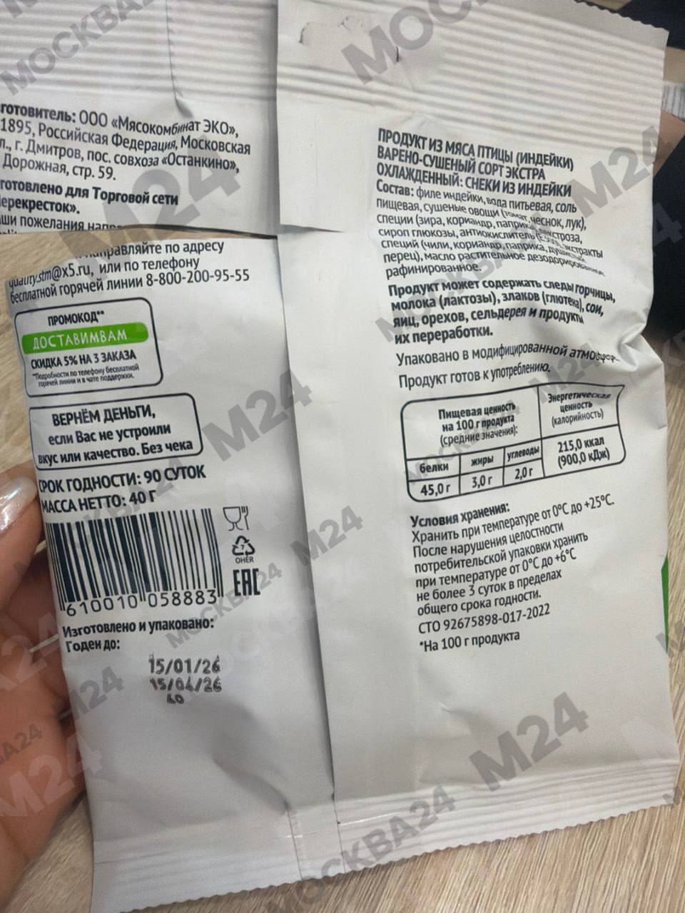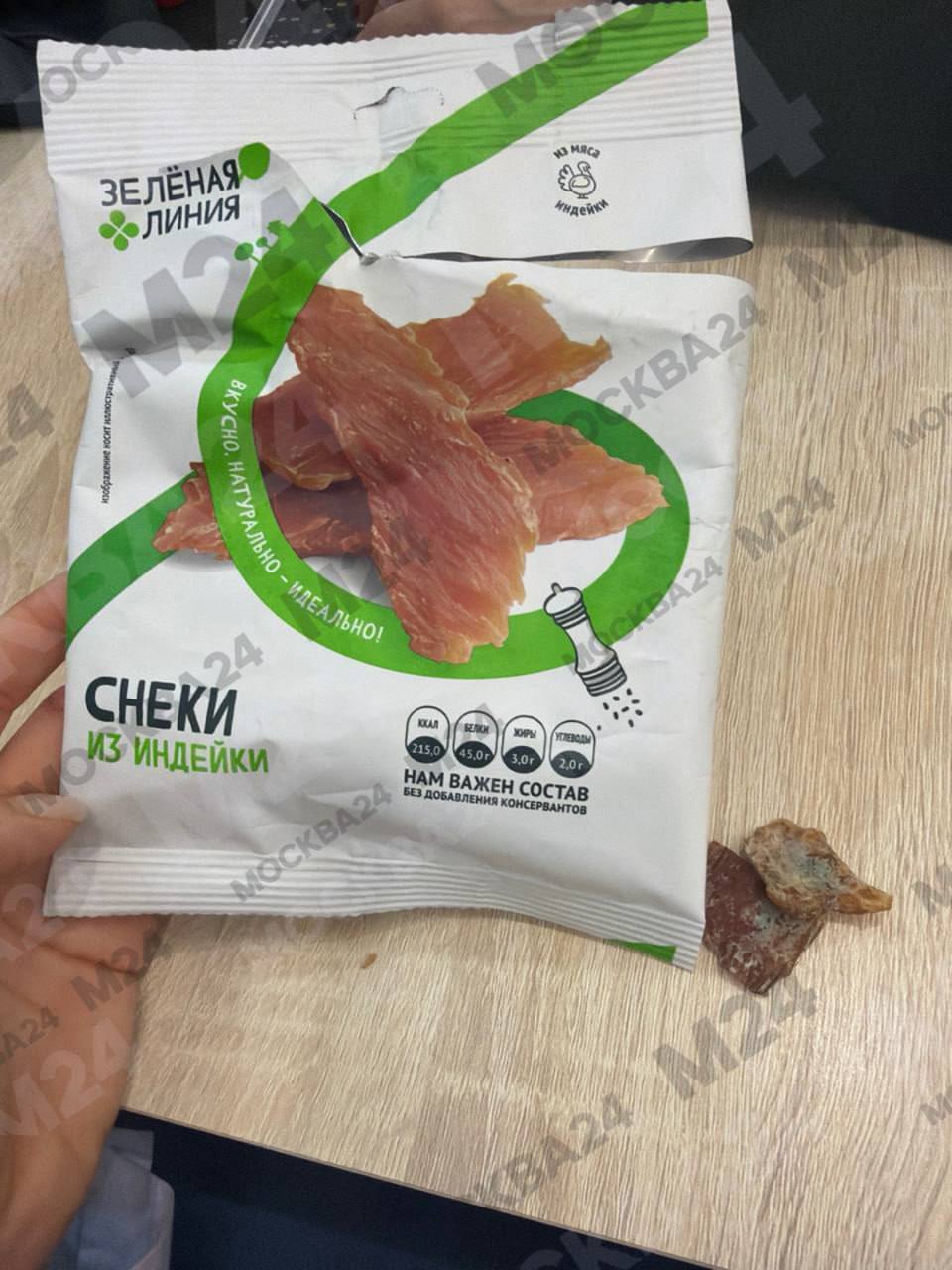 Снеки из индейки с налётом, похожим на плесень, купила москвичка в «Перекрёстке» по адресу Шмитовский проезд 16.