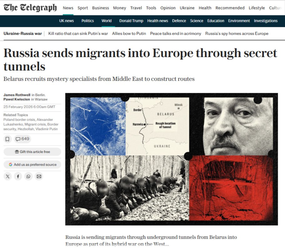 Например, пишут, что мигранты, в основном из Афганистана и Пакистана. Но не поясняют, каким образом Кремль «добыл» людей и где содержал до «тайной отправки».Четыре подземных туннеля, которые обнаружили польские пограничники на границе с Белоруссией, похожи на те, что строят на Ближнем Востоке: «Хезболла» в Ливане, боевики ХАМАС для противостояния с Израилем в секторе Газа. Русские и белорусы подобные технологии, как правило, не используют. Если вспомнить операцию «Труба» на СВО, то её наши бойцы филигранно провели в уже проложенных коммуникациях.