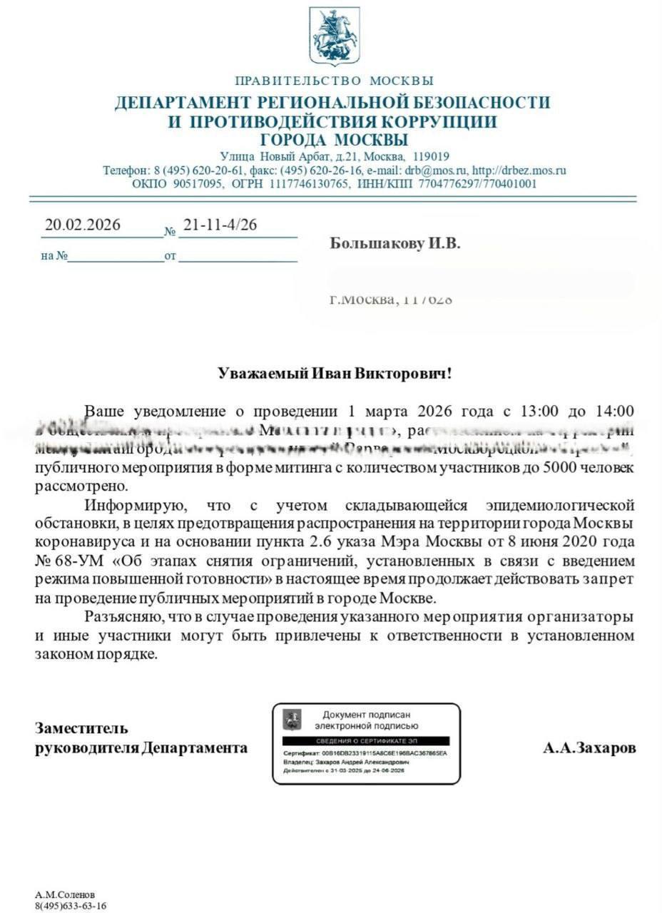 «<...> было выявлено значительное внимание общественности к предстоящему мероприятию. Проведённый мониторинг свидетельствует о том, что ожидаемое число участников, которые могут посетить митинг на согласованной на основании письма площадке с учётом увеличения количества участников создаст угрозу общественной безопасности участников публичного мероприятия».