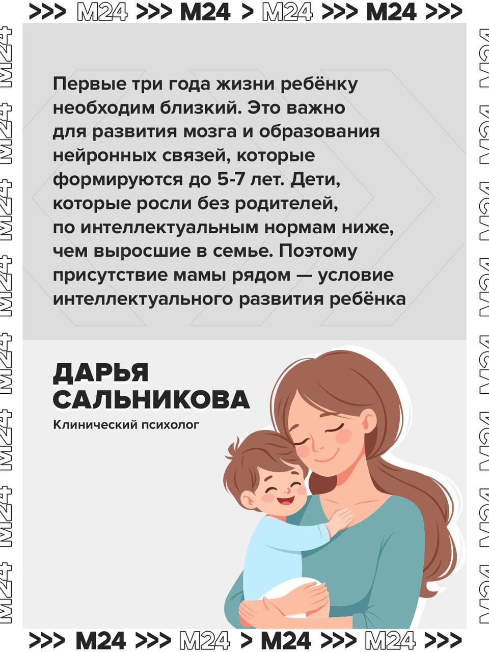 Но в первые годы жизни ребёнку особенно важно постоянное присутствие мамы. Иначе могут возникнуть проблемы с психологическим развитием и работой мозга, рассказала «Москве 24» клинический психолог Дарья Сальникова.
