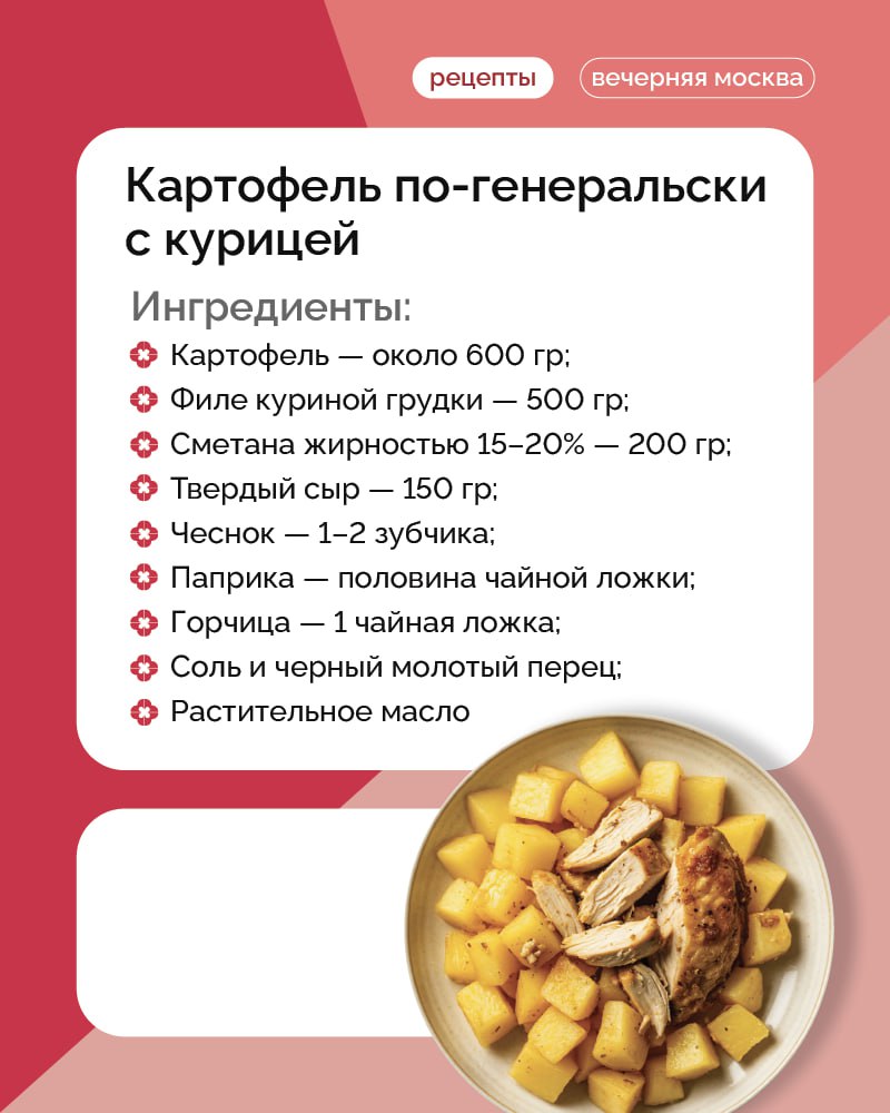 Если хочется приготовить сытный и при этом несложный ужин, который одинаково хорошо подойдет как для семейного стола, так и для гостей, стоит обратить внимание на картофель по-генеральски с курицей
