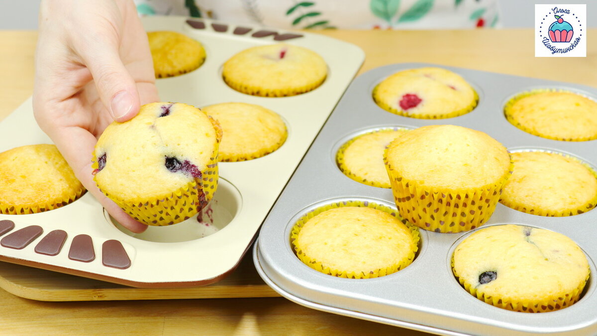 В другой миске перемешайте муку с разрыхлителем и содой. Постепенно просеивайте одну половину муки в тесто, перемешивая на минимальной скорости, чтобы мука увлажнилась. Затем влейте кефир, тщательно перемешайте и добавьте оставшуюся муку. Как только тесто готово, заполните формы примерно на 2/3 и при желании добавьте ягоды сверху.