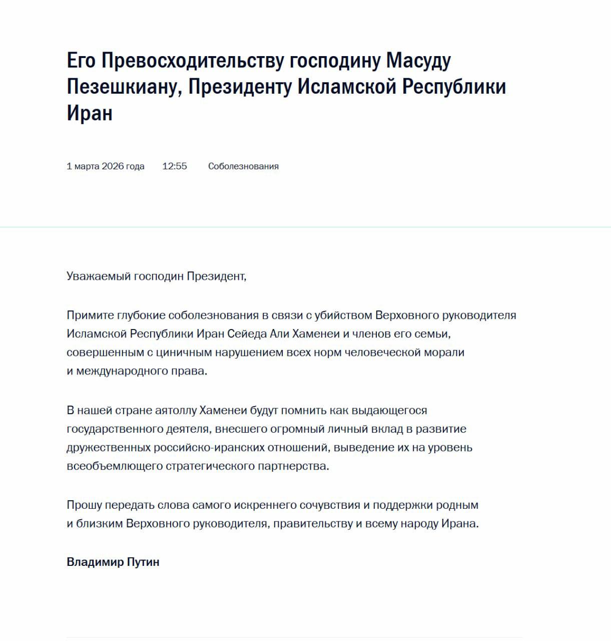 Путин выразил соболезнования президенту Ирана Пезешкиану в связи с гибелью верховного лидера страны Сейеда Али Хаменеи.