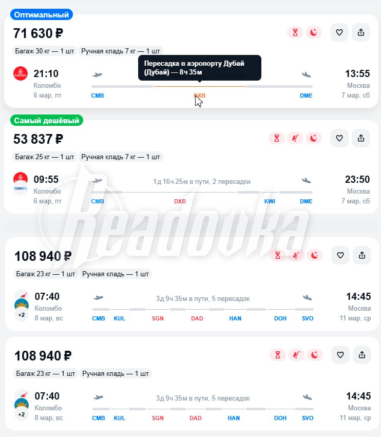 Несколько тысяч туристов из России не могут покинуть Шри-Ланку — у всех путешественников был транзит через Эмираты, но рейсы отменили. Туроператор PAKS отказался продлевать проживание и предложил людям самостоятельно оплатить новые билеты, рассказали Readovka застрявшие отдыхающие. Сейчас цены на билеты Коломбо-Дубай-Москва стартуют от 50 тыс за человека, но туристы опасаются лететь этими рейсами, поскольку есть риск повторной отмены. Путь через другие страны стоит от 100 тыс до 180 тыс — в некоторых случаях лететь придется с пятью пересадками более трех дней. За неимением других вариантов многие соглашаются и на такое «путешествие».