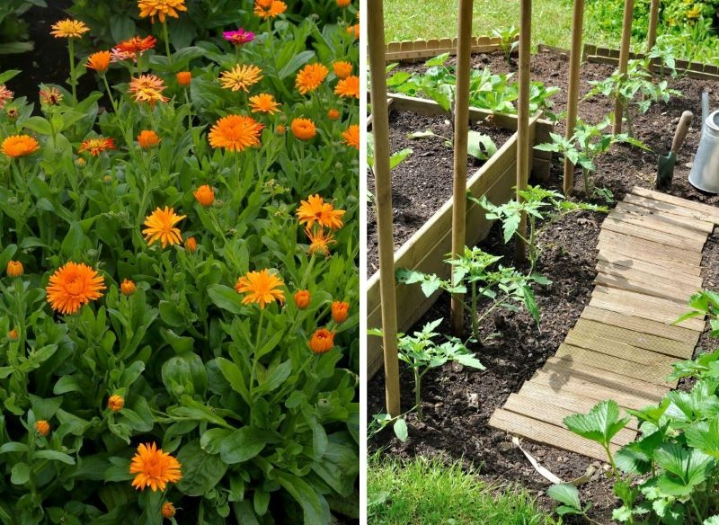 Бархатцы особенно полезны в соседстве с томатами, капустой, морковью и перцем, а также обеспечивают надежную защиту для клубники и кустов малины.