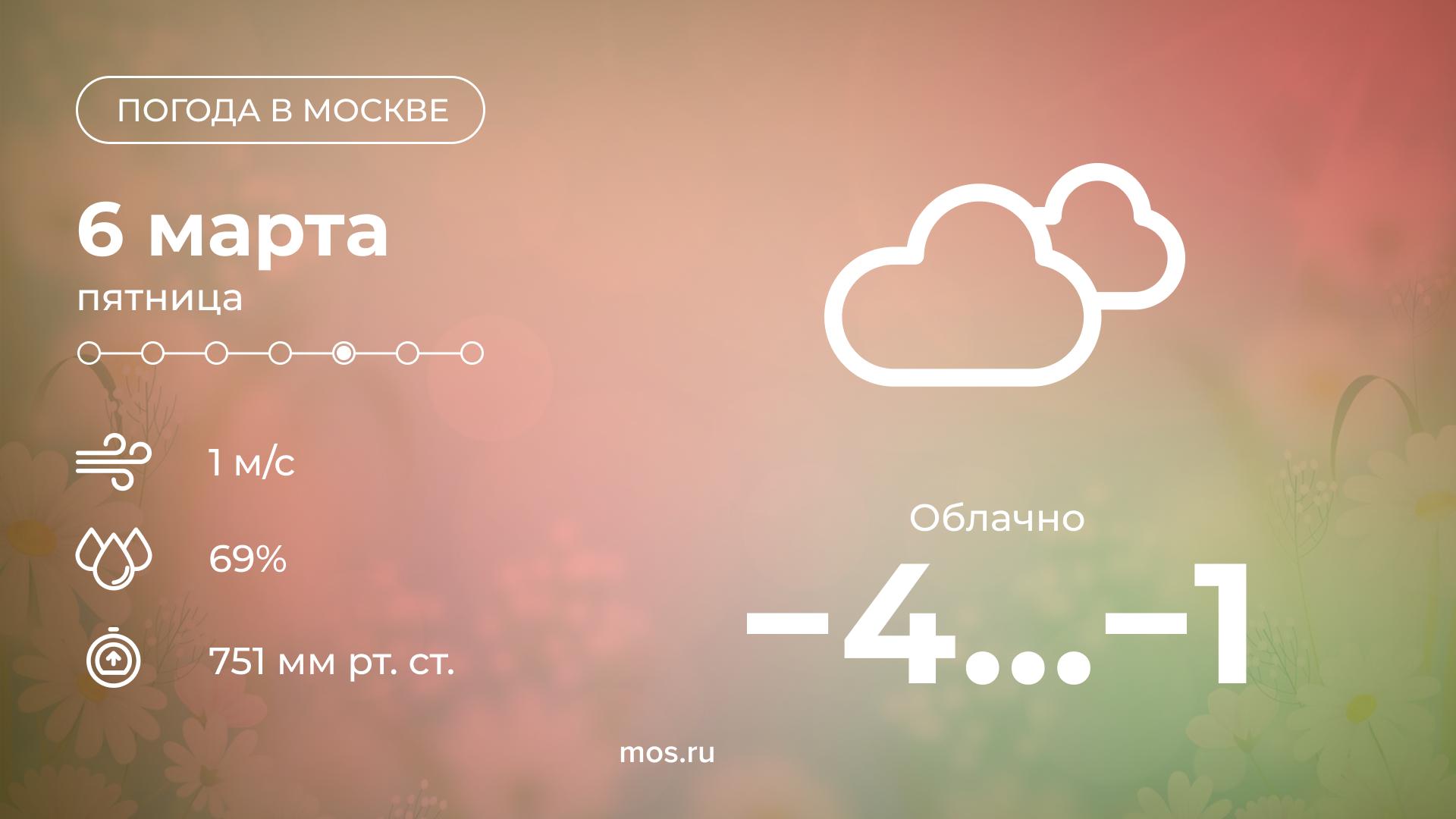 Доброе утро! Сегодня в Москве будет облачно. Столбики термометров днем покажут от 4 до 1 °С. Вечером возможен слабый снег с дождем.