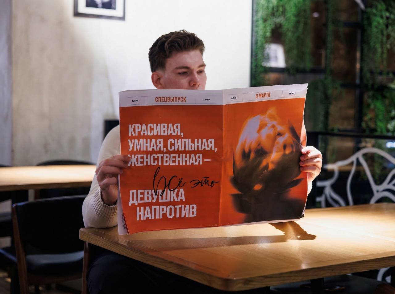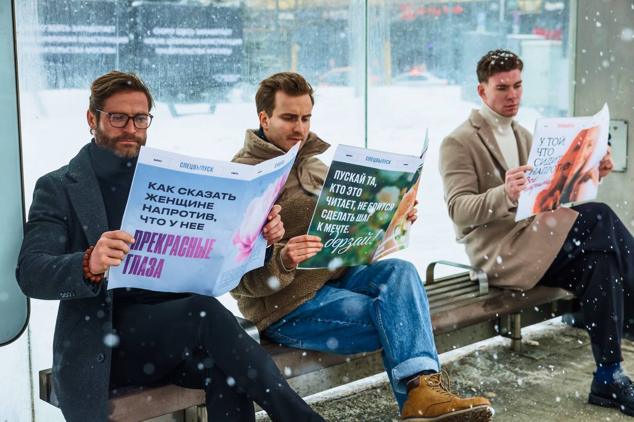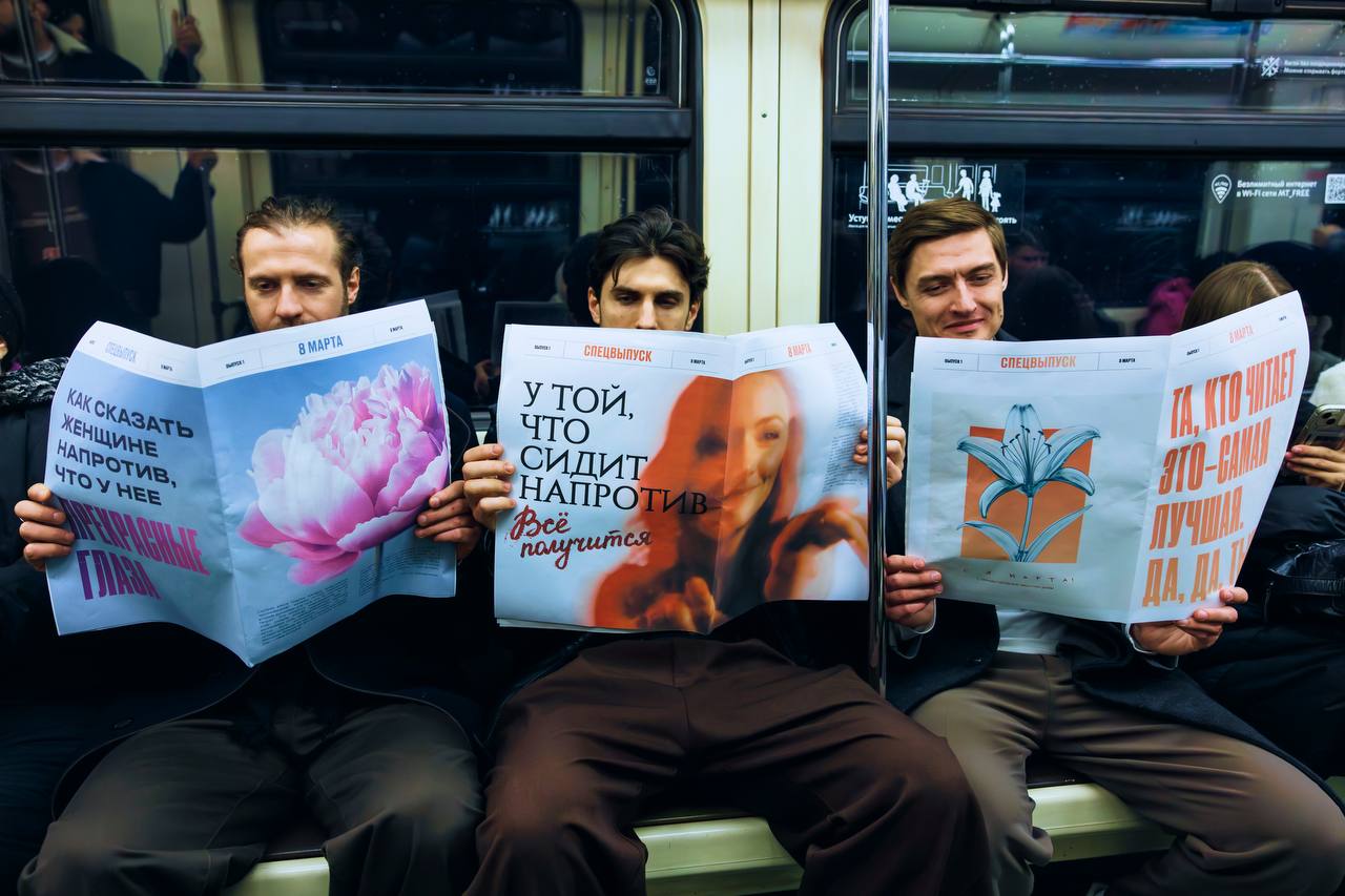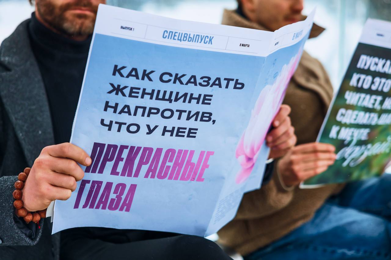 Увидели сегодня необычные развороты газет, на которых вместо сухих заголовков и новостей — комплименты и вдохновляющие фразы для дам, находящихся напротив.